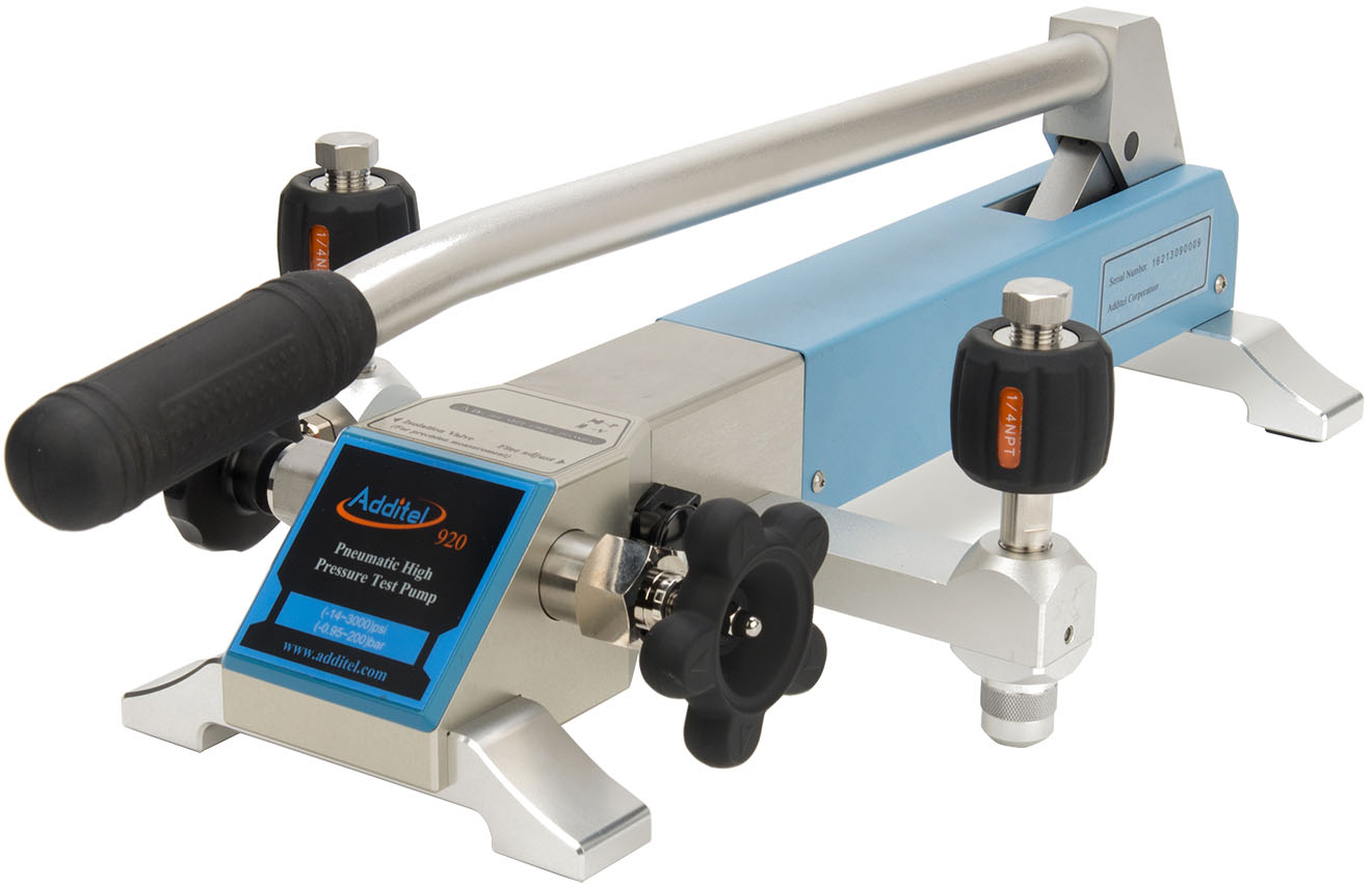 The Additel ADT 920 and 920HV high pressure test pumps are hand-operated pressure pumps designed to generate pressure from 95% vacuum to 3,000psi (200bar). With a long lever, it takes only 40 seconds to reach 3,000 psi (200 bar). The high volume (HV) model has been outfitted with a higher volume pump to provide added capacity. A high-quality screw press is designed for fine pressure adjustment, with an adjustment resolution up to 10 Pa (0.1 mbar).
