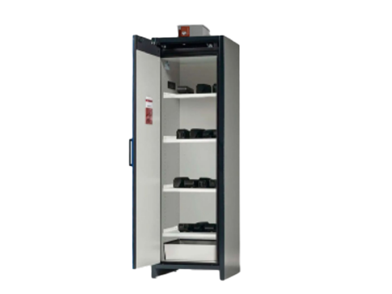 The Asecos Model ION-SDA series is a storage solution for lithium-ION batteries. It’s triple hinged door offers 90 minutes of fire protection with a scratch and impact resistant surface. The door mechanics are placed outside of the storage compartment, allowing for increased protection. It is self closing with integrated automatic thermal release system and intumescent sealant. The ION-SDA includes a keyhole with cylinder lock that has a locking state indicator. The integrated open base facilitates easy transportation.