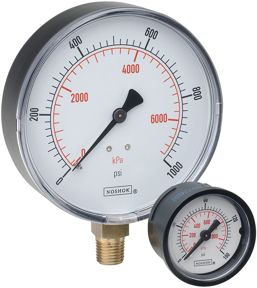 The Bourdon MEX2 / MEX3 pressure gauge is available in a dry or liquid-filled version, with liquid fill options of high viscosity glycerin, low viscosity glycerin/water, or silicone oil. Standard accuracy is ± 1.6% (Class 1.6 according to EN 837-1). Available connections include G 1/4in, 1/4in NPT, and 1/8in NPT.