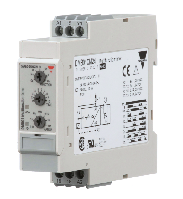 The Carlo Gavazzi DBB51 timer is a true delay on release timer with a knob adjustable time range from 1 to 10s. It has a combined AC and DC power supply, providing flexibility in installation and application. The DBB51 operates when the connected power supply is interrupted the set time period starts. At the end of the set time period, the relay will release. If power supply is reapplied before the relay releases the time is reset and the relay will remain on.