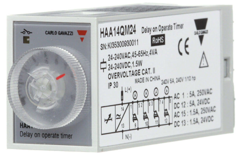 The Carlo Gavazzi Type DAC01 timer is a Star-delta control relay with two adjustable time ranges: Star function (0.1 to 600s) and star to delta function (50 to 130ms).