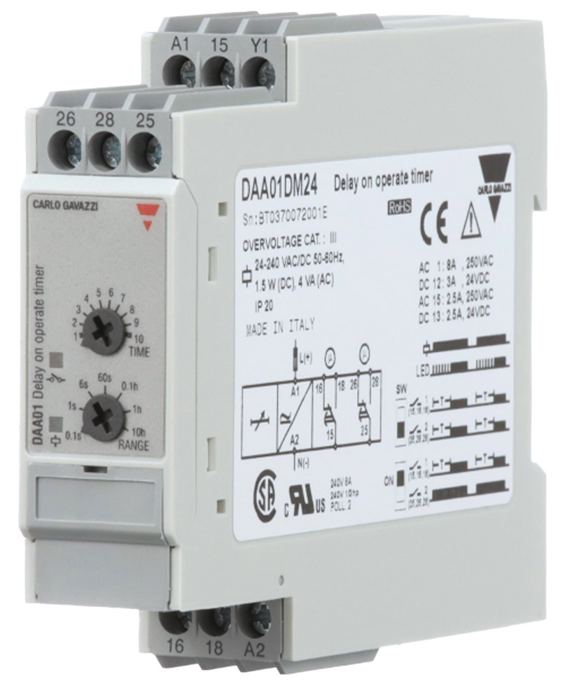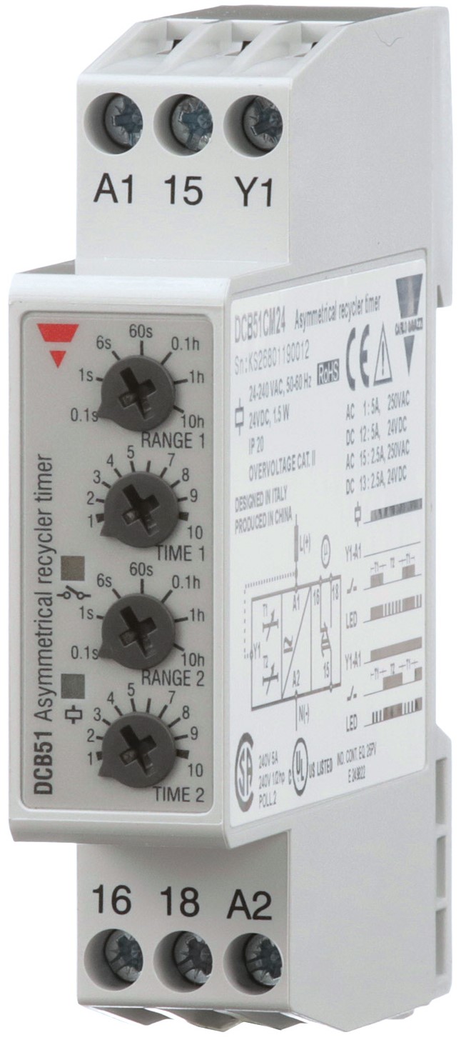 The Carlo Gavazzi Type DCB51 Asymmetrical Recycler Timer provides two selectable functions: asymmetrical recycler ON first, and asymmetrical recycler OFF first. Time range and settings between the ON and OFF times are knob adjustable, and the alternating sequence continues until the power supply is interrupted for at least 200ms.