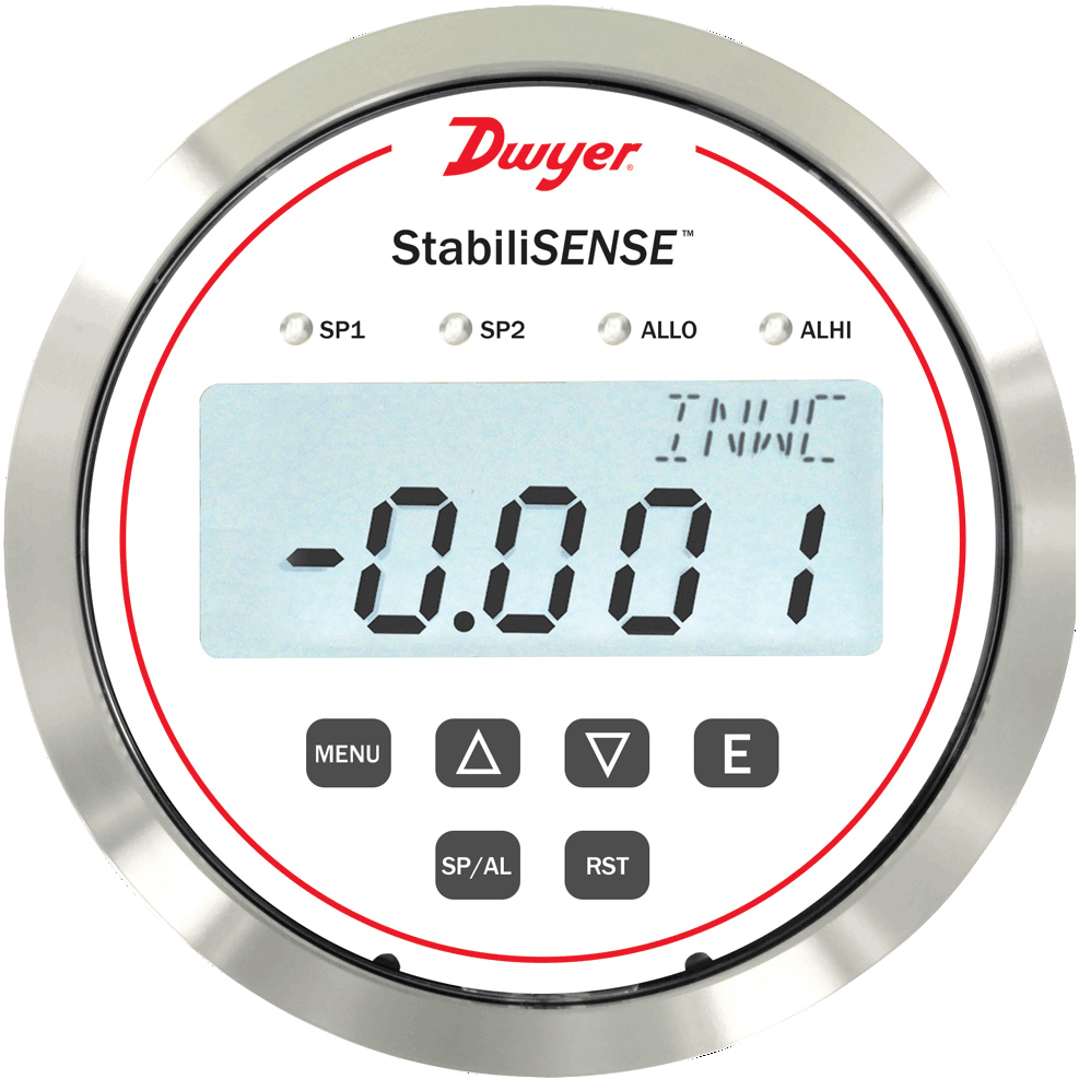 The Dwyer Series RPMC StabilSENSE Pressure Monitor is designed for critical low differential pressure applications that require stringent pressure monitoring and alarming. The Series RPMC can be configured to monitor positive or negative pressure in protected environments and clean manufacturing areas. The RPMC is a complete system which enables access to pressure, security, calibration, and alarm setup. The RPMC StabiliSENSE critical room pressure monitor has a brushed stainless steel bezel that allows for easy cleaning.
