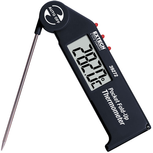 The Extech 39272 pocket thermometer is a fold-up thermometer with 4.5″ stainless steel adjustable probe. You can adjust the probe from 0 to 180° for storage or measurement. The Extech 39272 pocket thermometer is accurate to within ± 1.8˚F (-22 to 482˚F); ± 1˚C (-30 to 250˚C) and has a temperature range of -58 to 572˚F (-50 to 300˚C).