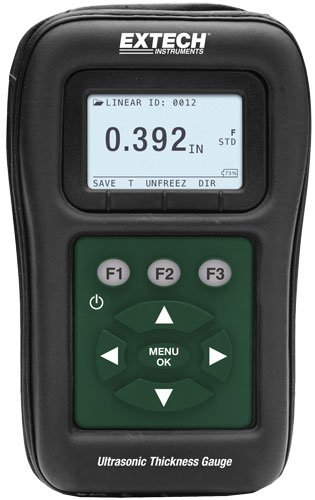 The Extech TKG150 Ultrasonic Thickness Gauge is designed in compact, handheld, rugged housing ideal for field use. The ultrasonic technology allows for non-destructive thickness measurements for primarily steel structures. The Echo to Echo function measures the metal thickness only. The differential mode displays the difference from the actual thickness measurement and a user entered reference value. The TKG150 also features velocity mode with displays acoustic sound speed.