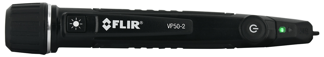 The FLIR VP50-2 is a durable, CAT IV-rated non-contact voltage detector featuring light, vibration, and beeper feedback alarms and a powerful LED flashlight. Use the VP50-2 to reliably check whether an AC circuit is live before beginning work; detect voltage on exposed conducting parts or through insulation; identify live wires within switchboxes, switches, and outlets; or trace live wires and map circuits. With an ergonomic and drop-tested design, the FLIR VP50-2 is the right choice for professionals performing field troubleshooting and verification of electrical installations within residential, commercial, and industrial buildings.