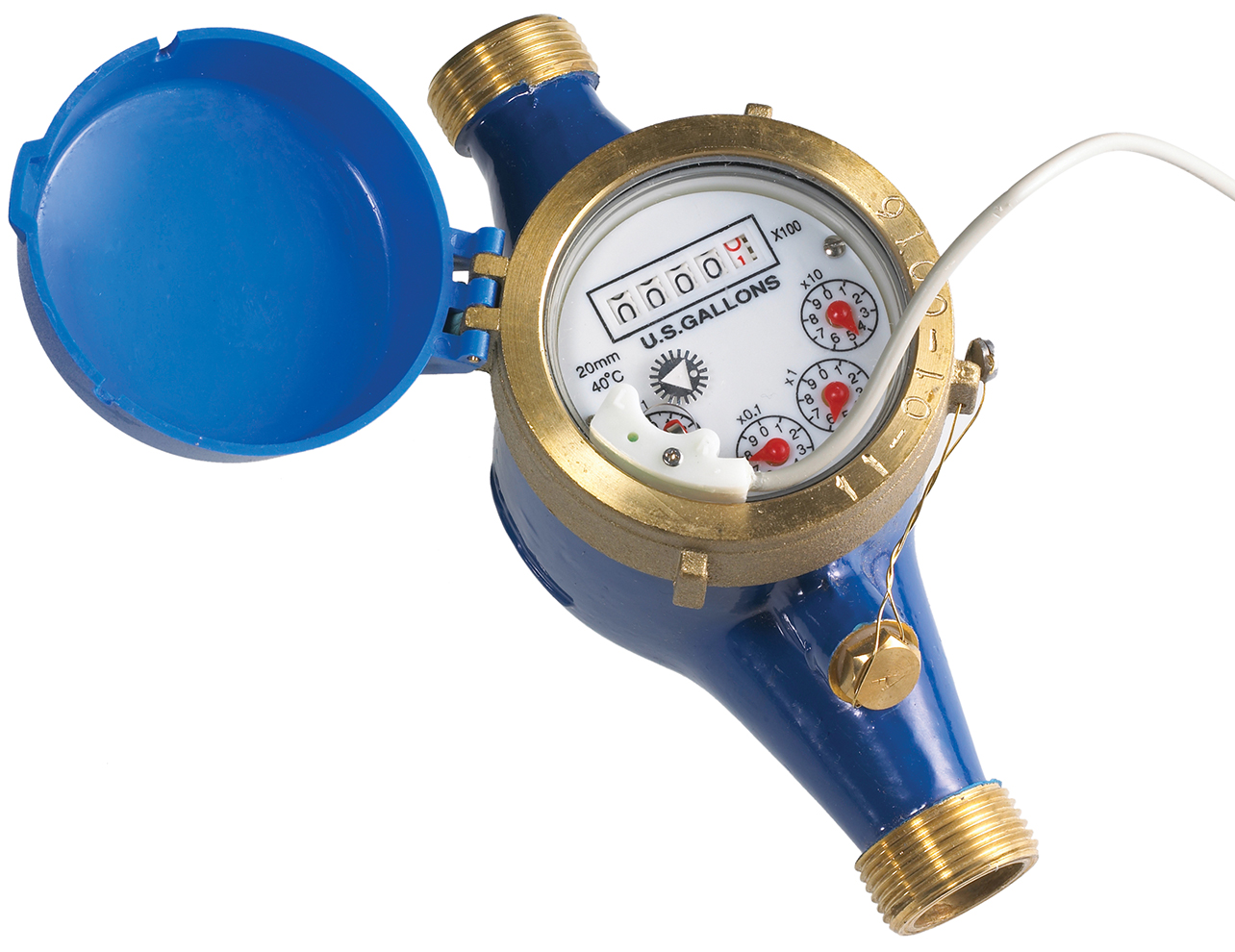 The FloCat ACS Series water meter uses the widely accepted multi-jet principle, as a gear train drives the register totalizer dials. For pulse output meters, a reed switch sensor is attached to the outside of the lens and detects a magnet arm that has replaced one of the dial pointers. The reed switch output is a dry contact closure and does not require power.