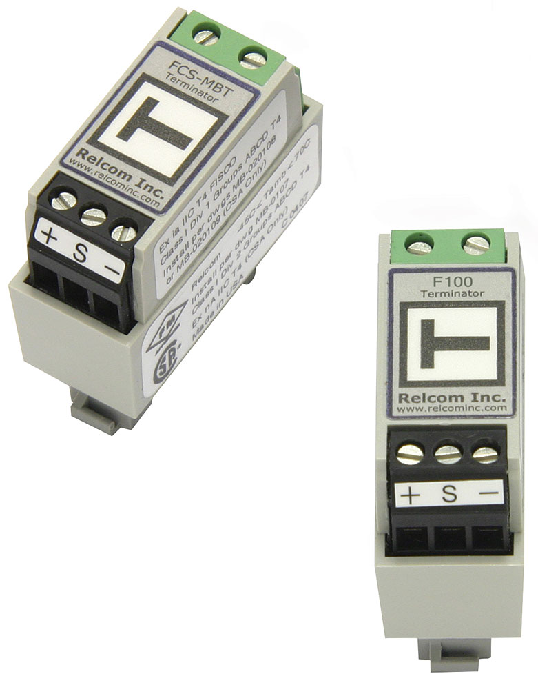 The MTL fieldbus terminators are used to meet the requirements of fieldbus standards that buses be terminated at both ends to prevent signal reflections. In many applications, one terminator is built into the power conditioner, which is usually located near the control system. The MTL range of fieldbus terminators are ideally suited to act as the second terminator, which is either integrated into the Megablock or fieldbus barrier wiring component or added in the form of a separate DIN-rail mounted unit. A large “T” is visible on all terminator labels for easy identification of the terminator location. Additionally, the F100 and FCS-MBT(-XE) provide differential and common-mode (cable shield) overvoltage protection.