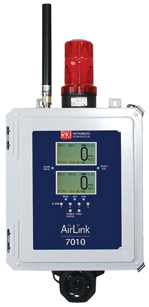 The RKI Instruments AirLink 7010 hybrid controller supports up to 32 wireless sensor transmitter inputs. Four of the channels can be setup for 4-20 mA wired input, making this hybrid controller compatible with both wireless and wired sensors. The AirLink 7010 controller has a 5 button interface, 2 LCD display with LED backlighting, and a NEMA-4X weather proof enclosure.