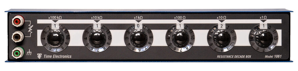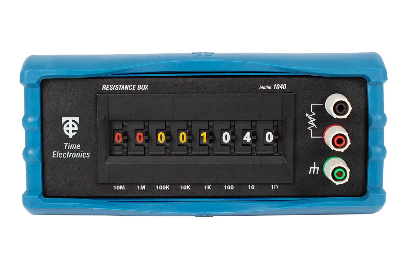 The Time Electronics 1040 decade resistance box offers increment steps of 1Ω, over a range of 1Ω to 100MΩ. Special attention has been given to the reliability of operation for the 1040. A special multiple gold contact arrangement ensures low contact resistance and continued operation even if a contact fails.