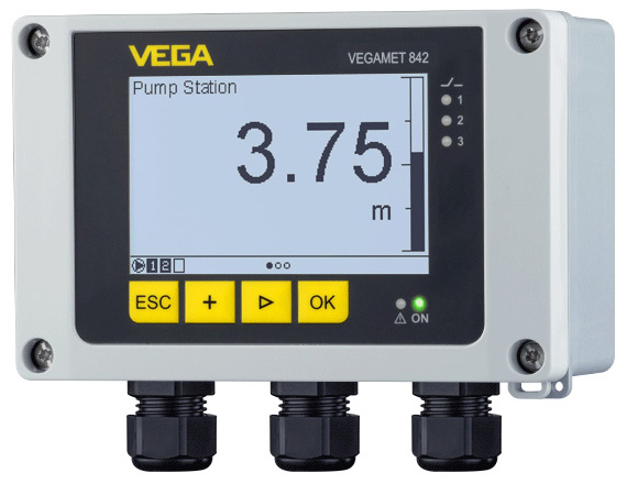 The VEGA VEGAMET 842 controller feeds the connected 4 to 20mA sensors, processes the measured values, and displays them. A large display for data visualization is integrated in the housing designed for rough field conditions.